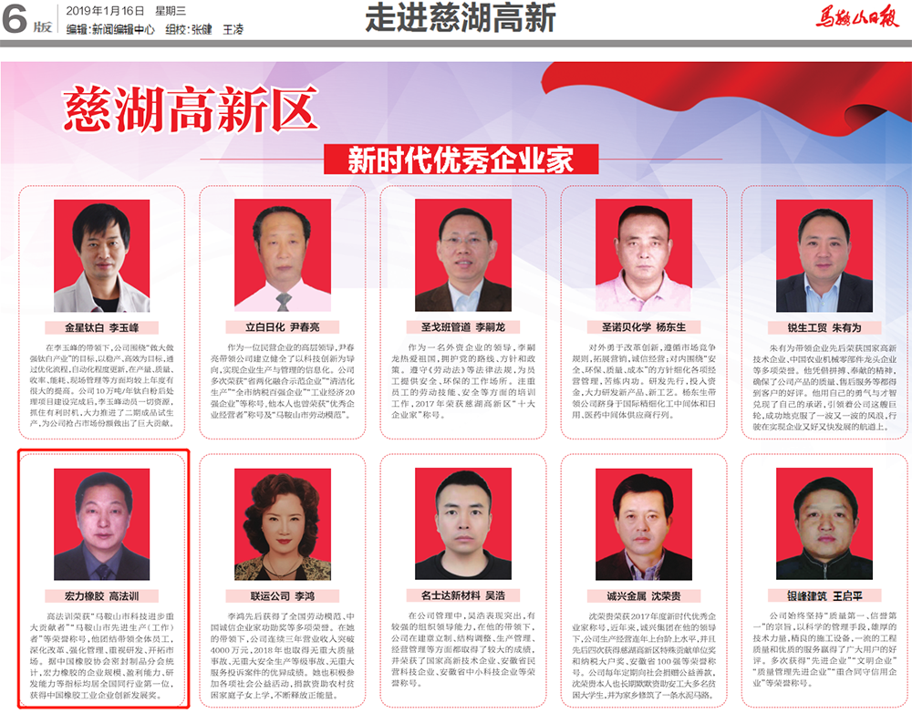 2019年1月16日,宏力橡膠董事長高法訓(xùn)出席慈湖(國家)高新區(qū)召開“加快推進(jìn)高質(zhì)量發(fā)展動員大會”,高新區(qū)重獎新時(shí)代優(yōu)秀企業(yè)家和優(yōu)秀單位,高法訓(xùn)獲“新時(shí)代優(yōu)秀企業(yè)家”稱號,公司獲“2018年度經(jīng)濟(jì)增長三十強(qiáng)企業(yè)”“2018年度納稅大戶”“2018年度科技創(chuàng)新十佳企業(yè)”,榮獲4個獎項(xiàng)。作為宏力員工我們感到無比驕傲和自豪!