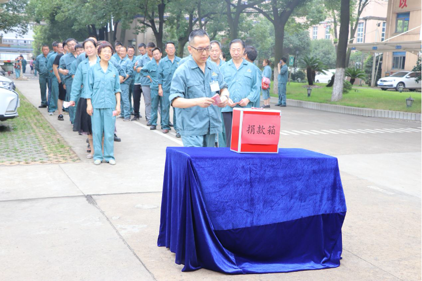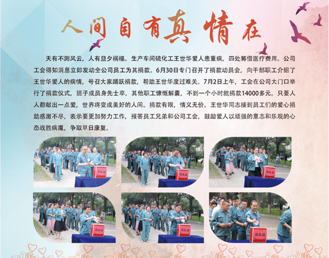 有不測風(fēng)云,人有旦夕禍福。生產(chǎn)車間硫化工王世華愛人患重病,四處籌借醫(yī)療費(fèi)用。公司工會得知消息立即發(fā)動全公司員工為其捐款。6月30日專門召開了捐款動員會,向干部職工介紹了王世華愛人的病情,號召大家踴躍捐款,幫助王世華度過難關(guān)。7月2日上午,工會在公司大門口舉行了捐款儀式,班子成員身先士萃,其他職工慷慨解囊,不到一個(gè)小時(shí)捐款14000多元。只要人人都獻(xiàn)出一點(diǎn)愛,世界將變成美好的人間。捐款有限,情義無價(jià)。王世華同志接到員工們的愛心捐助感激不盡,表示要更加努力工作,報(bào)答員工兄弟和公司工會,鼓勵(lì)愛人以頑強(qiáng)的意志和樂觀的心態(tài)戰(zhàn)勝病魔,爭取早日康復(fù)。